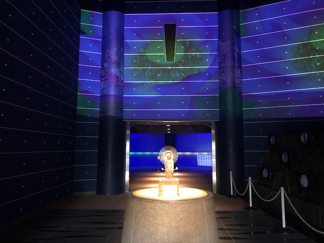 暗い部屋は煩悩をイメージしており、奥の扉が開くと慈悲を表す光で照らされる演出です。